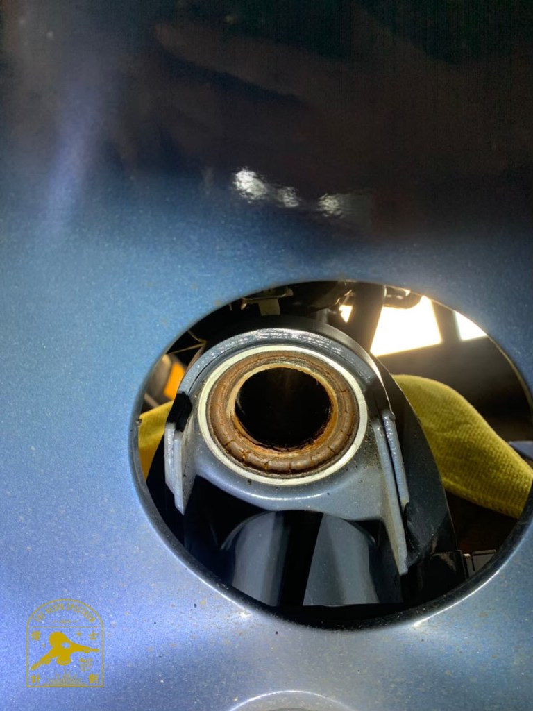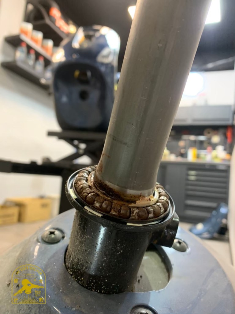 原因是因為轉向軸承上的油膜遭受雨水、洗車的水、濕氣造成鏽蝕產生,等到已經有狀況浮現出來後再想要去上油保養已經來不及了,只能將軸承整組更換新品。