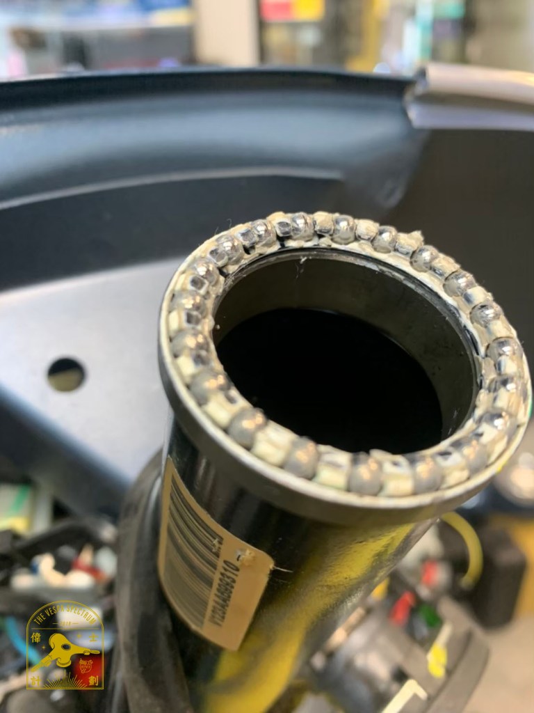 - A4:我們在維修的過程都會堅持使用進口的原廠零件(坊間有一些會使用ET8的國產零件重新包裝VESPA LOGO的包裝袋,那下座形式有些微落差,反而更不耐用。)再來我們都會將易造成溼氣累積的入口,以高耐水耐腐的油脂做一個填堵的動作,並且在安裝時確實潤滑軸承的每一顆珠子,基本上我們重新安裝過後的轉向軸承都有一定的耐久度,不用擔心。