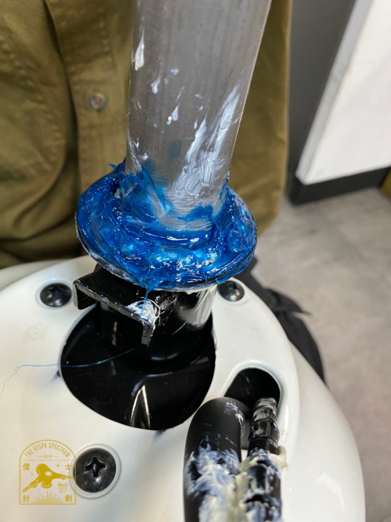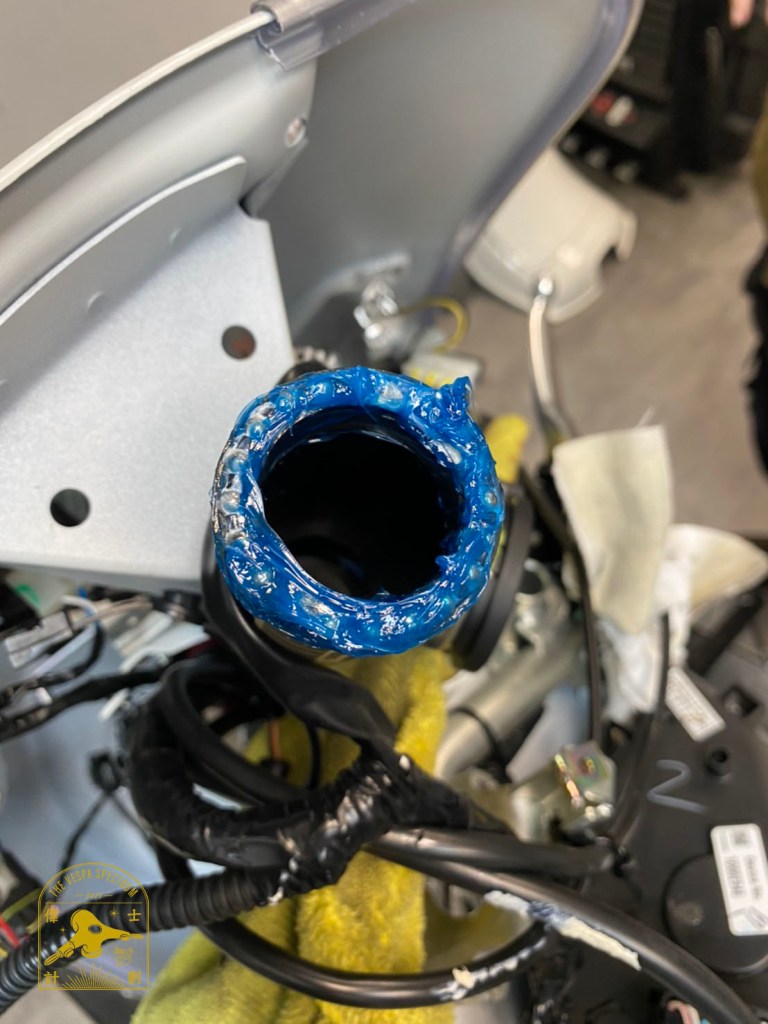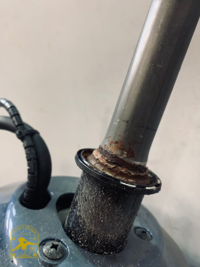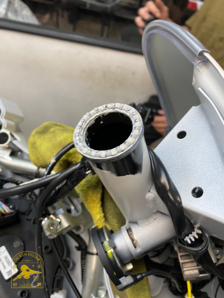 - A1:偉士牌Vespa現在為原裝進口的車輛,從組裝好到引進台灣,會需要一定的時間,這段時間絕大部分的時間都待在港口、貨櫃、甚至是海上,基本上都是鏽蝕產生的好發地點,所以基本上不只是偉士牌,有買過進口機車的,有些品牌的車輛也是不乏有轉向軸承壞掉的問題。那針對此問題,我們在我們店所販售出的新車都會將珠碗重新加強油膜,並且給予保固,若在保固期限發生此問題,都是可以免費換新的。以下是我們新車交車前,卸下前叉檢查油膜狀態的照片(圖3、圖4):