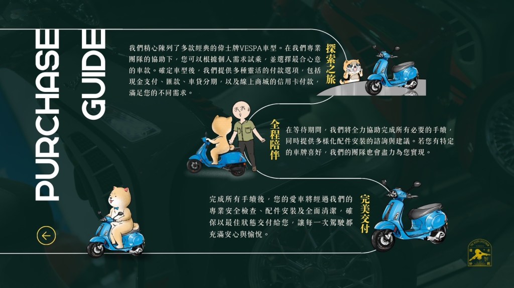 - 探索:我們陳列著許多型號的偉士牌VESPA,經我們的專業團隊協助下,根據個人需求試乘和選擇心儀的車款。選定車型後,我們提供多種付款方式,包括現金、匯款、車貸分期、線上商城信用卡付款。