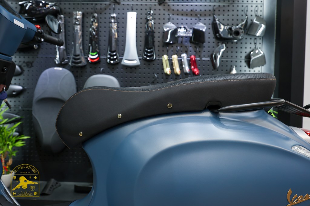 眼尖的朋友一定會發現,座墊側邊多了 金色金屬鉚釘設計!它象徵 Vespa 對細節的執著。也為了整體增添高級感。椅墊的縫線配色也增加層次感。