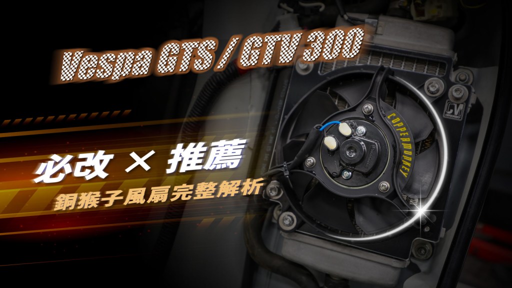 這次要介紹的這款 「銅猴子 Copper Monkey 高效散熱風扇」,就是專為 偉士牌 Vespa的GTS 300/GTV 300 黃牌大車系列車主打造的散熱升級方案。它不只是改善風扇聲音這麼簡單,而是從啟動溫度、材質、控制方式到馬達規格,全方位強化。