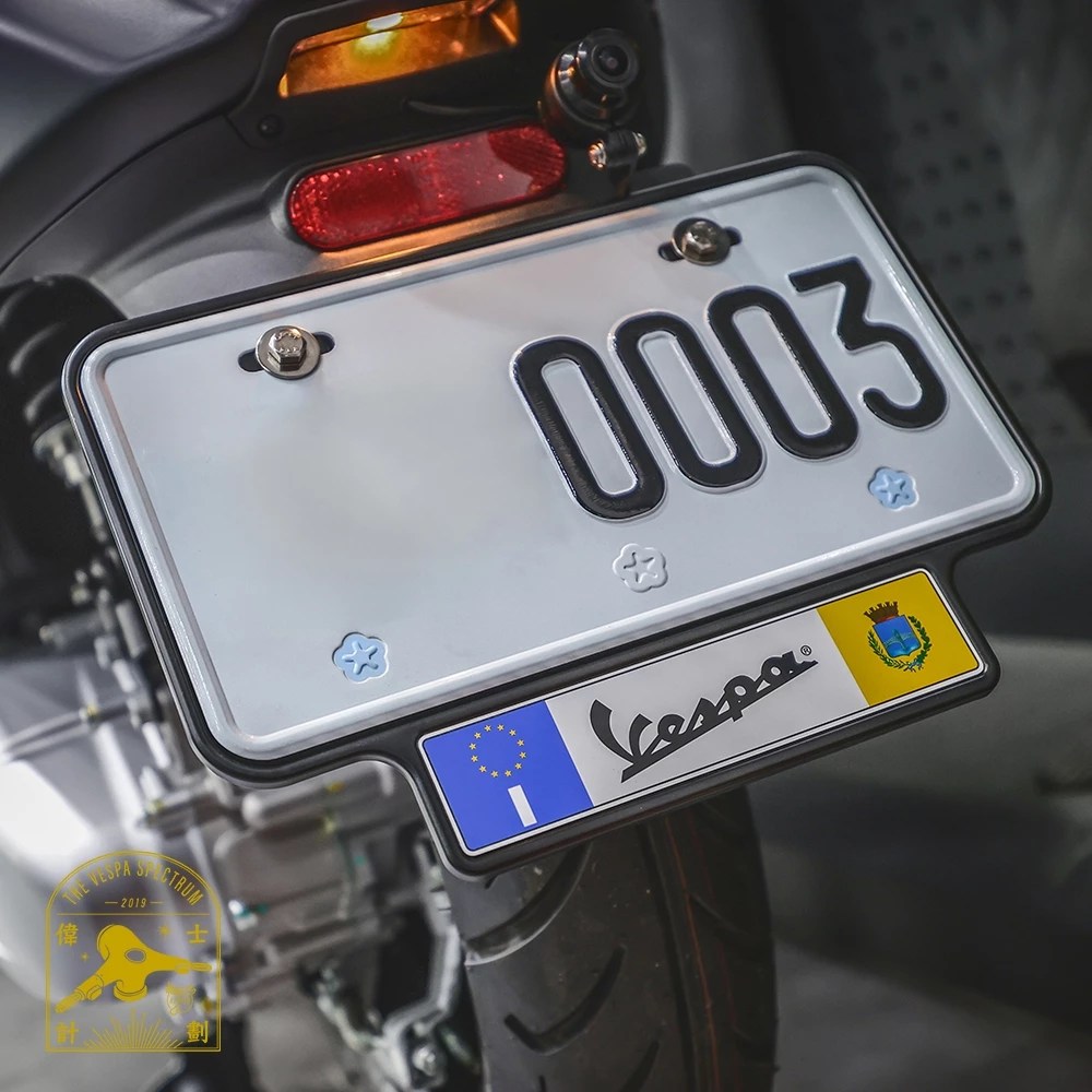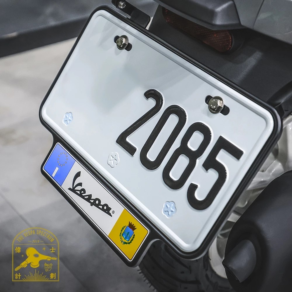 車牌框是 Vespa 偉士牌小資車主最推薦的入門改裝,百元即可讓車尾視覺變得俐落。霧面黑外框耐看不浮誇,底部延伸的小飾板也讓車尾更具完整度。